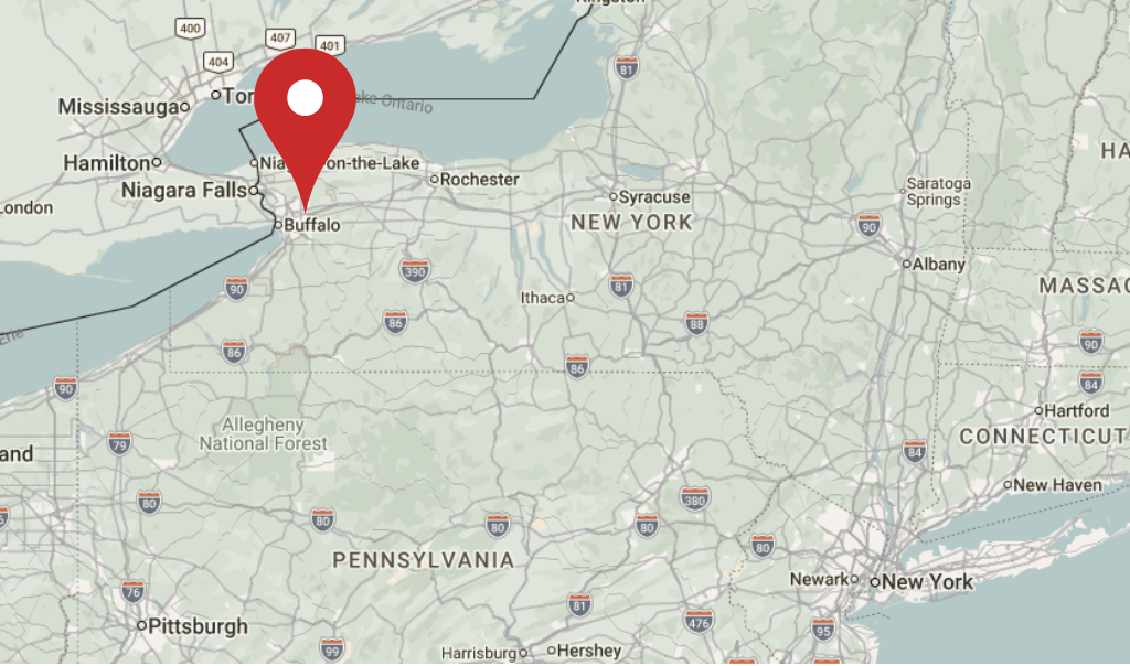Buffalo sits on the eastern shore of Lake Erie in Western New York, just 20 miles south of Niagara Falls and about two hours from Toronto.